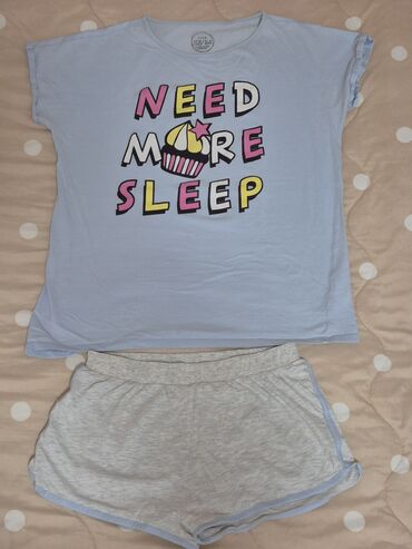 - Majica kratkih rukava, svetloplave boje sa šarenim printom “NEED MORE SLEEP” i motivom mafina.