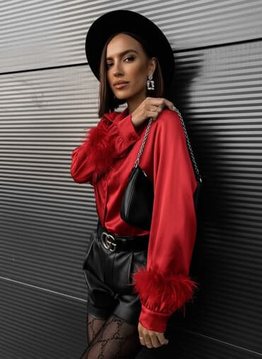 Satenska ženska košulja s perjem na manžetnama - Materijal: glatka, sjajna saten tkanina koja prijatno pada - Kroj: klasična košulja sa kragnom i dugmadima sprijeda; dugi rukavi sa efektnim perjem...