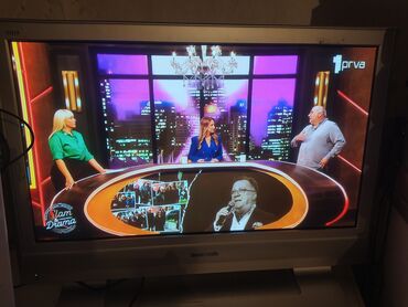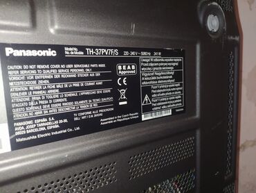 Panasonic plazma televizor, model TH-37PV7F/S, dijagonala 37 inča (aproks. 94 cm). Srebrno kućište sa postoljem. Na poleđini fabrička oznaka i specifikacije: napajanje 220–240 V ~, 50/60 Hz, potrošnja 241 W. Ugrađeni zvučnici napred (rešetkasta maska sa Panasonic logotipom). Prikaz na slikama potvrđuje rad TV prijemnika i prikaz kanala.