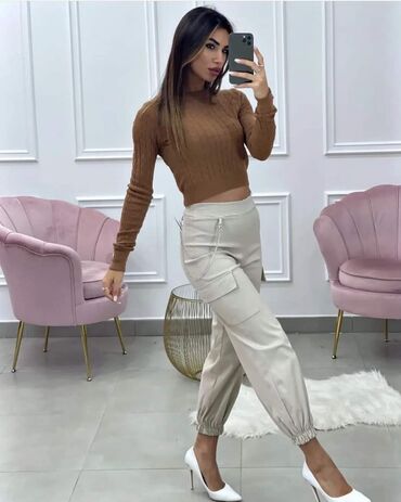 Bež ženske pantalone sa visokim strukom i pojasom na vez. Model sa blagim „paperbag“ strukom, elastičnom gumom i ukrasnom trakom napred. Širi, opušten kroj sa spuštenim preponama i ravnim nogavicam...