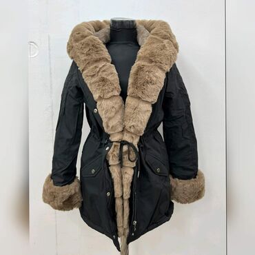 Duga crna prošivena jakna/kaput sa bogatim prirodnim bež krznenom postavom i detaljima: - široka krznena kragna koja se spušta duž cele prednje strane - krzneni manžetni na rukavima - dužina ispod...