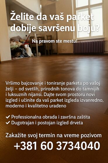- Decembarska ponuda: hoblovanje i lakiranje parketa (sa materijalom, bez lajsni) – 18 €/m²