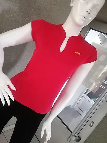 Crvena ženska majica kratkih rukava sa V-izrezom i malim prorezom. Na prednjoj strani, u predelu grudi, nalazi se diskretan natpis "OURO". Majica je slim fit kroja i izrađena je od mekog materijala, pogodna za svakodnevno nošenje ili sportske aktivnosti.