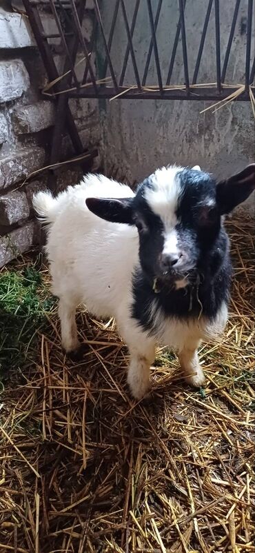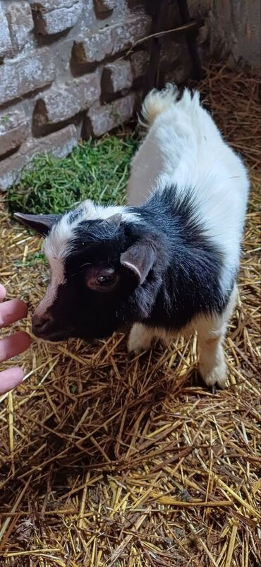 Patuljasta koza (jarac) – crno‑bela, kratke dlake, kompaktne građe.