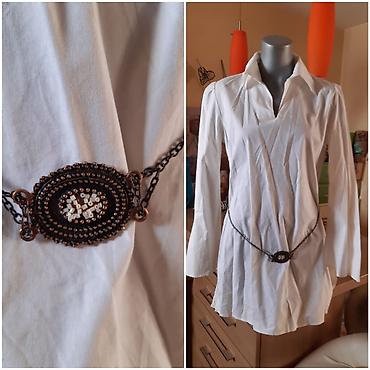 Perrynwhite bela košulja-tunika sa dugim rukavima i kragnom. Model blago strukiran, sa dekorativnim lancem oko struka i ovalnom kopčom sa ukrasnim perlicama sprijeda. Materijal: 97% pamuk, 3% likra (elastična, prijatna za nošenje). Pranje na 30°C, peglanje dozvoljeno, bez izbeljivača i hemijskog čišćenja.