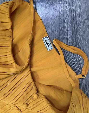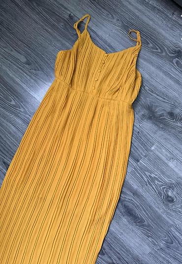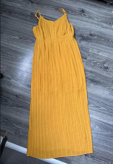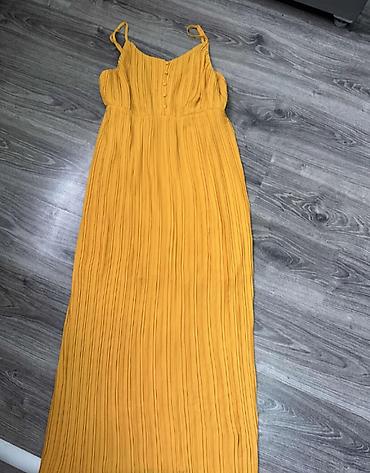 Zara midi haljina, model sa jednim ramenom i asimetričnim izrezima. Svetložuta nijansa, elegantno drapiranje sa strane i blago pripijena silueta dužine ispod kolena. Veličina: S (EU/MEX 26). Mater...