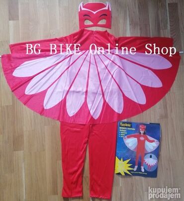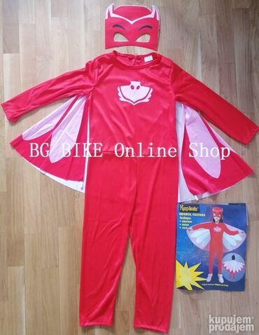 Pj masks PJ OWLETTE sova crveni kostim za decu Dve velicine: od 4 do 6 i od 7 do 10. **realno je da su velicine od 4 do 6 godina i od 6 do 8 godina** Za velicinu od 4 do 6 godina duzina kombinezona merena od ramena je oko 102cm. Za velicinu od 6 do 8 godina duzina kombinezona merena od ramen je oko 112cm. Krila su ušivena i imaju na krajevima mali lastiš kako bi provukli srednji prst na ruci. Preko 200 vrsta kostima: NOVO Kostim za decu deciji kostimi za maskenbal, maskembal , maska maske za halloween noc vestica ili zurku, rodjendan**POGLEDAJTE OSTALE NASE OGLASE****> > > > > > > > > > > > > > > > > > > > > > > > > > > > > > > > > > > > > > > > > > ****Ovaj artikal mozete poruciti na sledece nacine:****1) Porukom ovde na sajtu sa podacima za slanje i brojem telefona****2) Pozivom na mobilni ili porukom SMS, Viber, Whatsapp u periodu od 10 do 18h** Trudimo se da odgovorimo i posaljemo artikal u kratkom roku. Pre slanja cemo obavezno jos jednom potvrditi detalje. Robu saljemo Post Expressom. Postarinu placa kupac prema cenovniku koji mozete videti na njihovom sajtu. Robu mozete preuzeti i licno na Novom Beogradu uz obavezan prethodni dogovor. Povracaj i reklamacije na robu u skladu sa Zakonom o zastiti potrosaca. BG BIKE ONLINE SHOPProfesora Vasica 80Vinca, BeogradMaticni broj: 65560429PIB: TR: 205--65