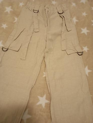 Bež cargo pantalone sa džepovima i dekorativnim trakama/prstenovima.