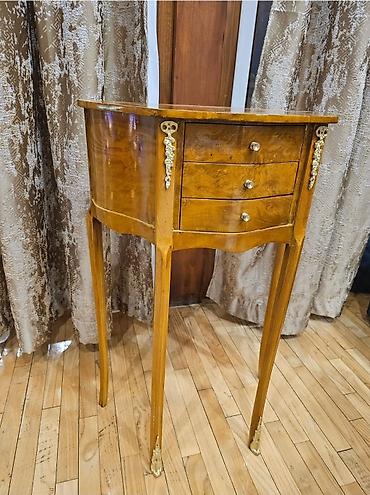 - Detalji: ukrasne mesingane/bronฤane aplikacije na gornjim uglovima i zavrลกecima nogu; male metalne ruฤkice na svakoj fioci.