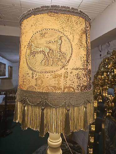 - Abažur: cilindričan, tkanina u zlatno–bež nijansama sa reljefnim motivima kočije/konja u medaljonima; ukrašen gustim kićankama i resama u dve nijanse (zlatna i maslinasto siva) i dekorativnom čipkom na ivicama.