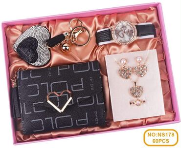 Poklon setovi – elegantno upakovani 1) Ženski set (u rozoj poklon-kutiji sa satenskom postavom): - Ručni sat u zlatnoj boji sa crvenim ciferom i ukrasnim kamenčićima na kućištu i narukvici - Dekor...