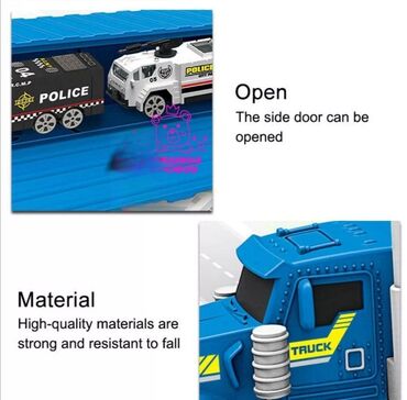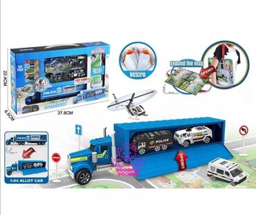 Ovaj veliki policijski set u razmeri 1:64 sadrži ukupno 14 delova, uključujući veliku platnenu stazu koja se rasklapa i sklapa u nosivu torbu. Set uključuje transportni policijski kamion sa kontejnerom koji se otvara sa strane, u koji mogu da stanu dva automobila. Tu su i 3 različita policijska vozila, jedan policijski helikopter i 7 saobraćajnih znakova. 🚔🚁