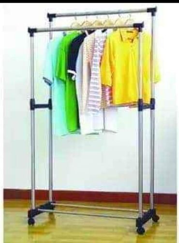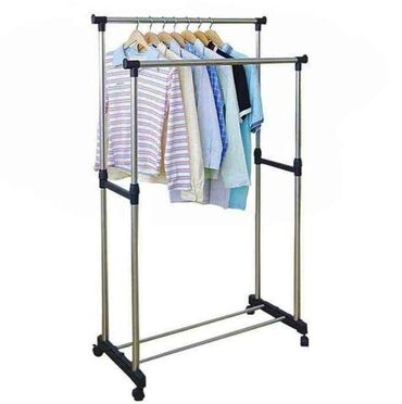 Dupli stalak za odecu nosivosti do 30kg,lak za montažu, ima točkiće tako da se lako moze premeštati sa jednog kraja prostorije na drugi. U crnoj boji.