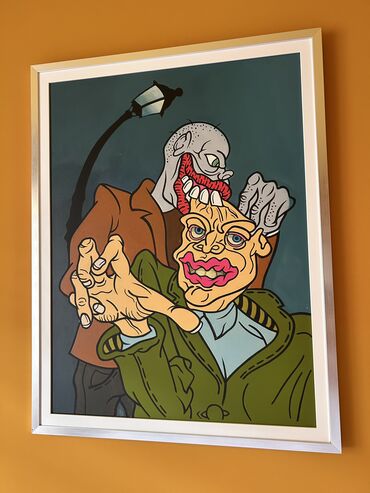 - Motiv: stilizovana, strip/pop-art scena u snažnim konturama i ravnim poljima boja. U prvom planu figura u zelenom kaputu sa naglašenim crtama lica i ispruženom rukom; iza nje druga, grotesknija figura sa istaknutim zubima. U pozadini ulična svetiljka i tamno-teal pozadina.