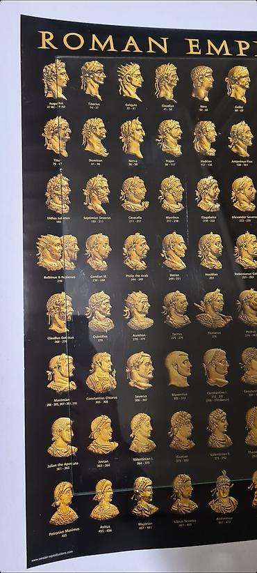 ▪︎Poster “Roman Emperors” – za ljubitelje antike, edukativni i kolekcionarski zidni plakat sa nizom raspoređenih 72 zlatnih profilnih portreta rimskih careva.