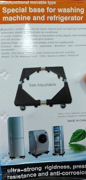Примена: погодно постављање тешких предмета као што је машина за прање веша. фрижидер, стерилизирнет и клима уређајКарактеристике: одржава кретање дна предмета, против влаге. против рђе и лако се воли и чистиМатеријал: ПА66, спољни точкови, метална поцинкована цевФункција: Смоотим, подесива димензија и практично кретањеКвалитет: ултра-јака отпорност на притисак и антикорозивна висина: 10 ЦМ. Максимално оптерећење: 138КГ, Максимално растезање: 56Кс56ЦМ