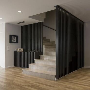 Pregradni zid od letvica „Black Form“ izrađen je od punog drveta i unosi jasan kontrast i karakter u svaki prostor. Tamne letvice ističu se u svetlim enterijerima, donoseći dubinu i moderan, uredan izgled. Zonira prostor bez zatvaranja i zadržava osećaj prostranosti. Sjajno je rešenje kako za dom tako i za poslovni ambijent. Pregradni zid od letvica „Premium Black“ donosi jasnu liniju i suptilnu eleganciju u svakodnevni prostor. Vertikalne letvice uvode ritam, blago razdvajaju zone i ostavljaju svetlost da slobodno prolazi. Zid ne zatvara, već stvara vizuelnu dinamiku i osećaj širine. Fleksibilan dizajn lako se prilagođava svakom kutku, od stepeništa do dnevne sobe ili radnog prostora. Mat crna površina daje savremen karakter i lako se uklapa u različite stilove enterijera. Tokom dana, igra senki menja atmosferu prostora, donoseći nenametljivu promenu iz svakog ugla. Pregradni zid od letvica „Premium Black“ je rešenje koje donosi red i jasnoću, bez gubitka kvadrature i svetlosti. SUMMA je na zidu. U jezgru savremenih enterijera nastaje forma koja ne deli prostor, već ga usmerava.