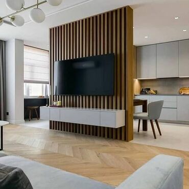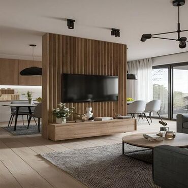 Pregradni zid od letvica „Echo Frame“ sa integrisanim TV panelom, fiksnim ili po izboru rotirajućim. Ovaj dizajn omogućava dodatak donje komode (zatvorene ili otvorene), čineći ga funkcionalnim akcentom prostora koji razdvaja, ali ne zatvara. Prirodni tonovi i ritmična forma unose toplinu u svaki enterijer. Pregradni zid od letivca „Echo Frame“ sa integrisanim TV nosačem donosi novu dimenziju organizacije enterijera, funkcionalan element koji deli prostor, a istovremeno postaje centralna tačka dnevne rutine. Letvice unose vertikalni ritam, dok stabilna centralna ploča omogućava ugradnju televizora, s jedne ili obe strane zida, u zavisnosti od potrebe prostora. U verzijama sa dodatkom donje komode, sistem dobija dodatnu funkcionalnost: zatvorene ili otvorene jedinice za odlaganje vizuelno ujedinjuju estetiku i praktičnost. Bilo da svoju ulogu pronalazi u otvorenim stanovima, apartmanima ili ugostiteljskim enterijerima, ovaj model daje jasan prostorni okvir bez masivnih pregrada i bez gubitka svetlosti. Opcionalna rotacija TV panela dostupna je na zahtev, dok se sam zid izrađuje po meri prostora i prema estetskim zahtevima klijenta. SUMMA je na zidu. U jezgru savremenih enterijera nastaje forma koja ne deli prostor, već ga usmerava.