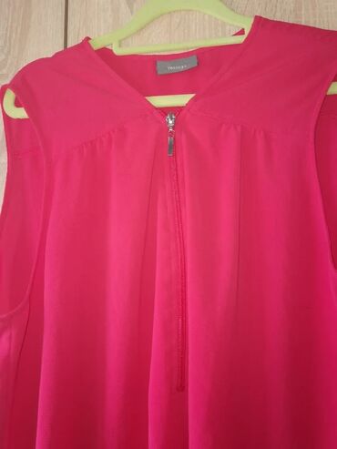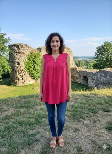 Dve elegantne bluze sa dugmadima 1) Tamnoplava bluza sa printom - Boja: tamnoplava podloga - Uzorak: bež, sitni motivi po celoj površini - Kroj: klasična košulja sa ovratnikom, dugi rukavi, zakopč...