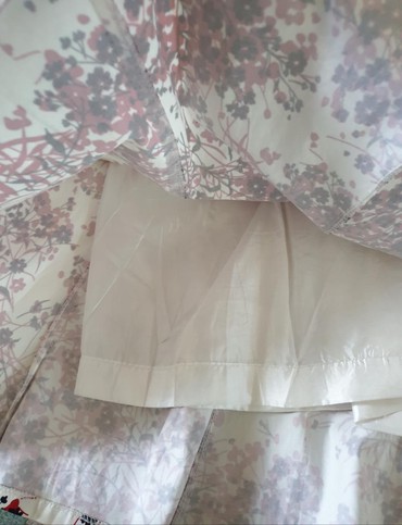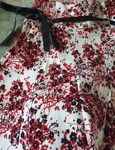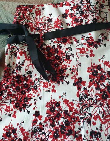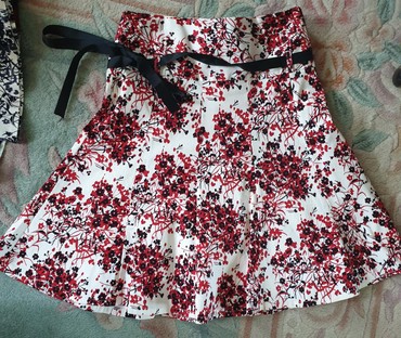 Prelepa, cvetni dezen, kombinacija crvene i crne, bela osnova. Do kolena, krojena u A. Jako kvalitetan puniji materijal koji sjajno stoji. Ima kaisic oko struka. Nosila sam je mozda 2-3×. Kao nova suknja !