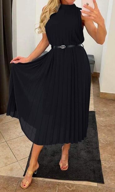 Elegantna večernja haljina – crna, duga, sa dramatičnim šlepom i visokim šlicem. - Kroj: sirena/suknja sa naborima napred, visoki otvor na butini, produženi asimetrični šlep sa strane. - Gornji de...