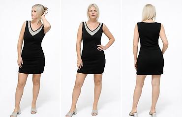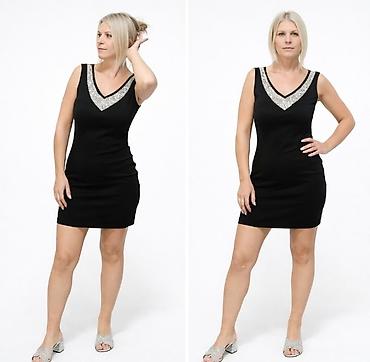 Crna haljina sa dubokim dekolteom. Duzina i sirina na slikama