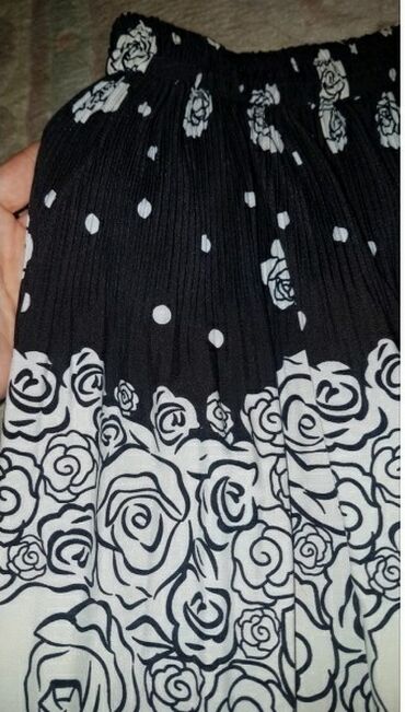 Prelepa plisirana suknja zaista divnog materijala poput svilenog. Gornji deo je sitno plisiran, a donji se siri. Nadam se da vidite na slikama. Ima lastis u struku pa je prakticno free size. Imam 3 iste, razlicitog dezena . Kod ove cvetne vidite kako stoji..sve su iste. Oko kolena su. Ispod je sorts koji se prvo obuce ali se naravno ne vidi. Crno bela, cvetna.