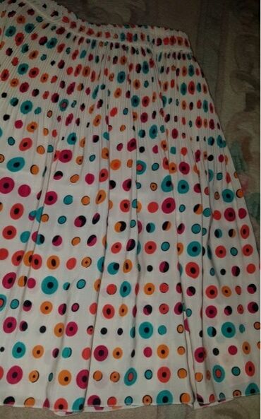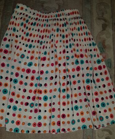 Prelepa plisirana suknja zaista divnog materijala poput svilenog. Gornji deo je sitno plisiran, a donji se siri. Nadam se da vidite na slikama. Ima lastis u struku pa je prakticno free size. Imam 3 iste, razlicitog dezena . Kod ove cvetne vidite kako stoji..sve su iste. Oko kolena su. Ispod je sorts koji se prvo obuce ali se naravno ne vidi. Sarena, roze, tirkiz, bez i narandzasta boja