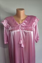Ženska spavaćica Orange, veličina XL (oznaka XL-96). Svetlosiva sa diskretnim ružičastim tufnama, dugi rukavi. V-izrez sa talasastim, ružičastim obrubom; ispod grudi satenska mašnica kao detalj. Do...