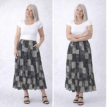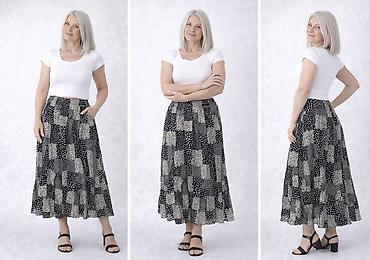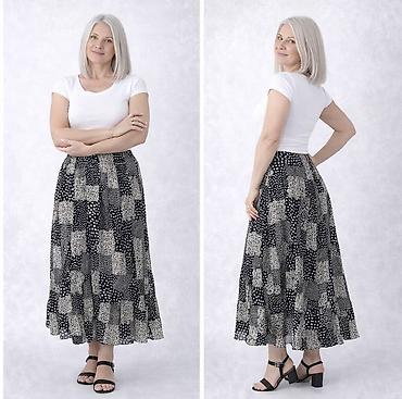 Asimetrična suknja sa patchwork printom - Kroj: lepršava, asimetrična ivica sa volanima - Dužina: midi do maxi u zavisnosti od visine (duža sa strane i pozadi) - Materijal: lagan, prozračan, prija...