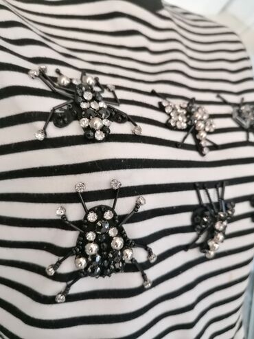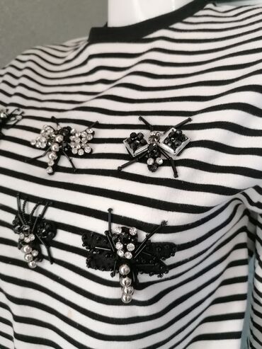Prugasta ženska majica sa 3/4 rukavima i aplikacijama - Boja: crno‑bele horizontalne pruge - Kroj: ravna silueta, dužina do kukova; okrugli izrez sa crnim porubom - Rukavi: 3/4 dužine - Detalji: d...