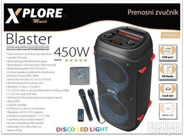 Prenosivi zvučnik KARAOKE XPLORE 450V BLASTER je visokokvalitetan zvučnik koji ima snažan bas efekat i savršen je pratilac za sve vaše avanture. Svojom snagom od 450V ispuniće prostoriju i okolinu lepim i čistim zvukom. Pronađite svoje omiljene plejliste bilo gde, od druženja kod kuće do plesnih žurki na plaži. Uključena su dva mikrofona (žični) i (bežični) tako da možete pevati uz svoje omiljene pesme i družiti se sa publikom. Zvučnik ima ugrađenu Bluetooth vezu tako da se možete povezati sa telefonom i tabletom. Kontrolna tabla ima kompletan set priključaka – AUX ulaz i izlaz, USB port i slot za SD karticu. Zvučnik ima ugrađenu TVS funkciju, koja vam omogućava da bežično povežete dva identična zvučnika jedan sa drugim. Zvučnik za karaoke ima atraktivnu kontrolnu tablu sa crvenim LED ekranom i daljinski upravljač koji omogućava lako podešavanje funkcija na daljinu. Zahvaljujući efektu plazme DISCO LED LIGHT, vaša zabava će biti obasjana prelepim bojama. U paketu se dodaju nožice tako da se zvučnik može postaviti u horizontalni položaj (pejzaž). Spremite se za nezaboravnu zabavu uz XPLORE KARAOKE PRENOSNI ZVUČNIK!