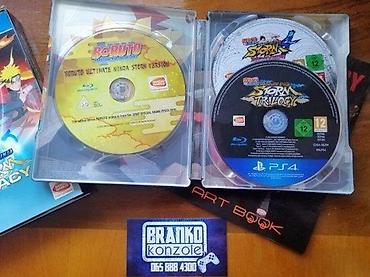 Prodajem original igricu za Sony Playstation 4 konzolu - NARUTO Ultimate Ninja Storm LEGACYIgra je kao nova. Original velika kartonska kutija + metalna kutija sa 3 diska + artbook. Sadrzi sve 4 igre (+ Bonus disk)Naruto Shippuden: Ultimate Ninja Storm 1, Naruto Shippuden: Ultimate Ninja Storm 2, Naruto Shippuden: Ultimate Ninja Storm 3 Full Burst i Naruto Shippuden: Ultimate Ninja Storm 4 Road to Boruto