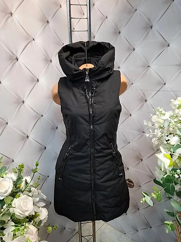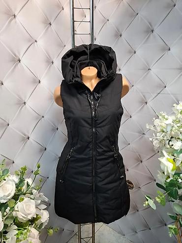 Ženska duga zimska prsluk-jakna sa kapuljačom i krznom veličina S, M - Model: dugi, prošiven prsluk bez rukava - Kapuljača sa obodom od veštačkog krzna, rajsferšlus po sredini - Dva bočna džepa sa...
