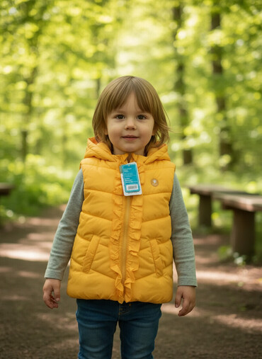 Komplet dečje odeće za hladnije vreme: - Prsluk sa kapuljačom: maslinasto zelena spoljašnjost sa prošivima, crni/dark navy rubovi, rajsferšlus napred, mali bedž/grb na levoj strani. Unutrašnjost s...
