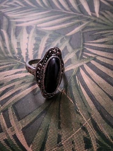 Prsten sa crnim kamenom i markazit detaljima - Elegantna duga ovalna