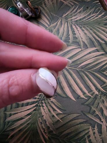 - Materijal: metalna baza u srebrnoj boji sa umetkom od prirodne školjke (svetlobeli ton sa prirodnom linijom u bež/smeđoj).