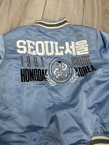 - Detalji: vez/logotip “서울” napred na levoj strani grudnog dela; na leđima veliki vez “SEOUL – 서울”, “1991”, “HONGDAE”, “COLLEGE”, “KOREA” i grb u sredini