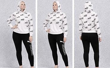 - Gornji deo: bela dukserica sa kapuljačom, all‑over PUMA logo print u crnoj boji. Rebrani završeci na rukavima i pojasu za udobno prijanjanje. Kengur džep nije prisutan – čist, sportski kroj sa kapuljačom koja lepo prekriva glavu.