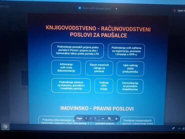Nudim obavljanje računovodstvenih poslova za preduzetnike paušalce, registracija, promena i brisanje u APRu, podnošenje poreskih prijava putem portala E-Porezi, prijava za eko taksu preko portala LPA, arhiviranje dokumentacije, slanje mesečnih naloga i provera uplate, upis radnog staža preduzetnika, vodjenje KPO knjige i obezbeđujem komunikaciju sa poreskim inspektorima. U domenu imovinsko-pravnih poslova, pripremam dokumentaciju i predajem je za ostavinsku raspravu u sudu i kod javnog beležnika, uz podršku tokom ročišta. Pružam usluge podnošenja svih poreskih prijava poreza na imovinu i pravljenje kupoprodajnih ugovora sa zakazivanjem overe kod javnog beležnika. Dodatno, nudimo pripremu dokumentacije i predaju zahteva za oslobađanje takse za RTS, priprema dokumentacije i predaja zahteva za starosnu, poljoprivrednu, porodičnu invalidsku penziju. Kontaktirajte nas za pouzdanu podršku u ovim oblastima. Karakteristike: Usluga: Računovodstvene usluge; Tip posla: Knjigovodstveni poslovi; Za koga: Paušalci; Podnošenje prijava: Poreske prijave; Podnošenje zahteva: LPA portal; Dodatno: Arhiviranje dokumentacije; Mesečni nalozi; Upis: Radni staž; Penizija: Starosna, porodična, invalidska; Knjige: KPO; Komunikacija: Poreska inspekcija; Usluga: Imovinsko-pravni poslovi; Priprema: Dokumentacija za ostavinsku raspravu; Podrška: Ročišta; Vrsta prijava: Poreske prijave na imovinu; Ugovori: Kupoprodajni; Overa: Javni beležnik; Zahtev: Oslobađanje takse za RTS. Predaja dokumentacije za sve vrsta penzija za fizička lica.