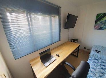 Radni sto – beli, visokog sjaja, sa fiokama i otvorom za kablove - Dimenzije: približno 140 × 60 cm (procena prema fotografijama; prostrana radna površina) - Materijal i završna obrada: ploča viso...