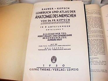 Rauber-Kopsch 1-4Lehrbuch und Atlas der Anatomie des Menschen. Leipzig. Georg Thieme,20 x 27 cm. -Lehrbuch und Atlas der Anatomie des Menschen in 6 Abteilungen. Abteilung 1. Allgemeiner Teil nebst Zellen und Gewebelehre. Besonderer Teil. Ä ussere Haut, 13. AuflageGeorg Thieme, Leipzig 1930 -Lehrbuch und Atlas der Anatomie des Menschen. ABTLG.4: Eingeweide – 13. Auflage. Verlag Leipzig Georg Thieme -Anatomie des Menschen ABTLG.5 UND 6: Nervensystem Sinnesorgane, 13. Auflage, Rauber-Kopsch Georg Thieme, Leipzig 1930, -Lehrbuch und Atlas der Anatomie des Menschen. Abt. 3: Muskeln. Gefä sse 13. Auflage, Rauber-Kopsch Leipzig, Greorg Thieme-Verlag 1929,