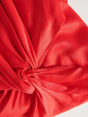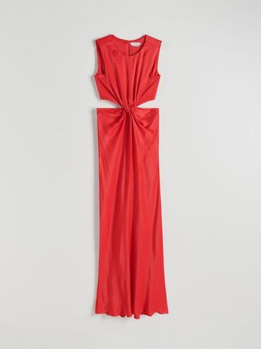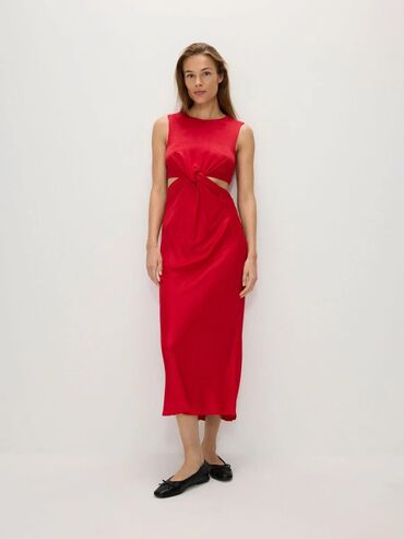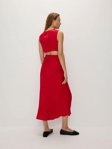 Crvena midi/duga haljina sa volanima - Boja: intenzivna crvena - Kroj: uska silueta sa spuštenim volanima u kaskadama preko prednjeg dela; volan na porubu i dekolteu - Bretele: tanke, podesive - D...
