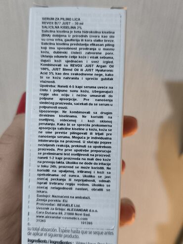 - Tip proizvoda: serum/piling rastvor (peel-off) sa 2% salicilne kiseline (BHA).