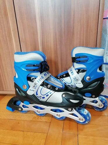 Roleri na četiri točkića (inline), crno‑ljubičasti dizajn. - Ležajevi: ABEC 7 (označeno na točkićima) – glatko i brzo klizanje. - Točkići: poliuretan, 72 mm (T2MM oznaka), postavljeni u nizu za bo...