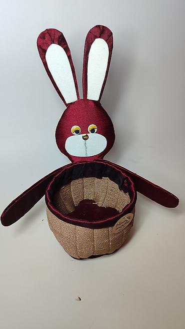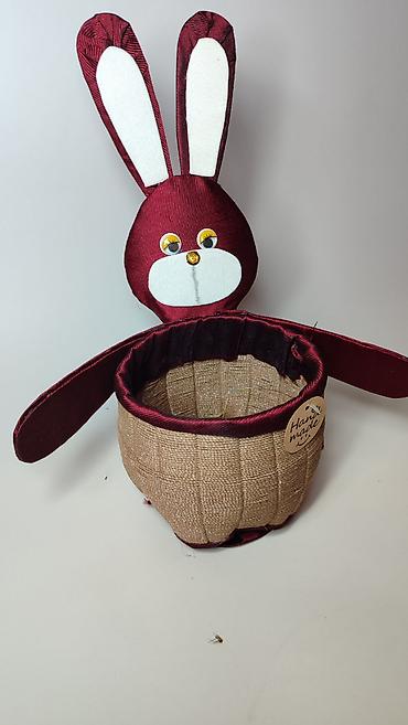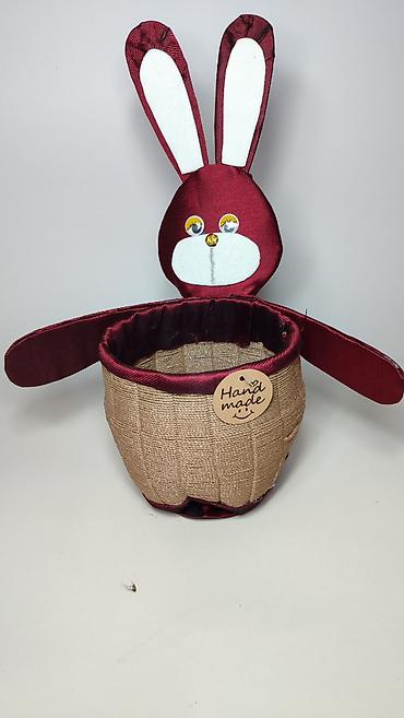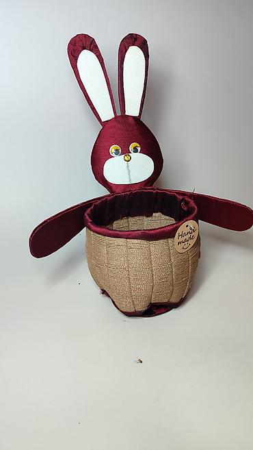 - Materijali: spoljašnja korpa od jute/platna sa teksturom, obrubi i zeka od bordo satena, detalji od belog platna i aplikacije za oči i njuškicu