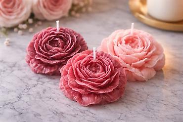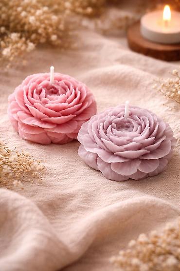 - Detaljno modelirane slojevite latice koje verno oponašaju raskošan cvet (ranunkula/božur stil), sa centralno postavljenim fitiljem.