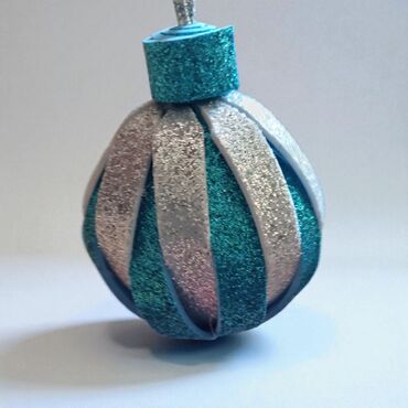 - Sjajna kugla sa spiralnim trakama: kombinacija tirkiznih i srebrnih šljokičavih traka, oblikovana u elegantnu sferu sa vrhom i omčom za kačenje. Tekstura sa glitter efektom po celoj površini pojačava refleksiju svetla.