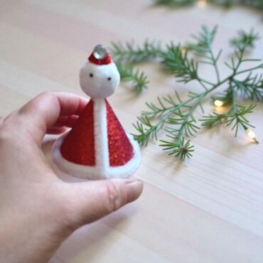- Figura Deda Mraza: mini dekor u obliku stožca, crveni šljokičavi „kaputić“ sa belim rubom od mekog materijala, okrugla glava sa diskretnim detaljima lica i kapica sa bisernim ukrasom na vrhu. Stabilna baza – može stajati na stolu ili se postaviti među grančice.