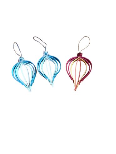 - Set visećih ornamenata u obliku kapljice/lučne latice: lagani ukrasi sastavljeni od traka u nijansama plave, svetloplave i kombinacije bordo–zlatne. Svaki komad ima sjajnu petlju za kačenje na granu ili girlandu. Prozračan dizajn daje trodimenzionalni efekat, a boje se smenjuju u slojevima.